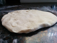 So, to start with, take three and a half cups of flour, a teaspoon of salt, a teaspoon of sugar and one and a half teaspoons of dry yeast and mix in a bowl. Now add a cup and a half of room temperature water and mix. You will have a very stick dough. Resist the urge to add more flour. Turn the dough out onto a floured surface and divide into two equal pieces. Place each piece in a bowl, cover with a cloth and leave to double in size (about an hour).